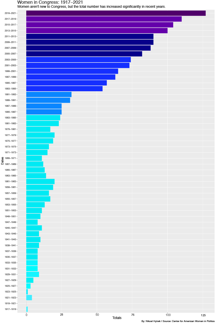 A series of data visualizations displaying the significance of the number of women elected to office and the work that’s left to do. Sample: